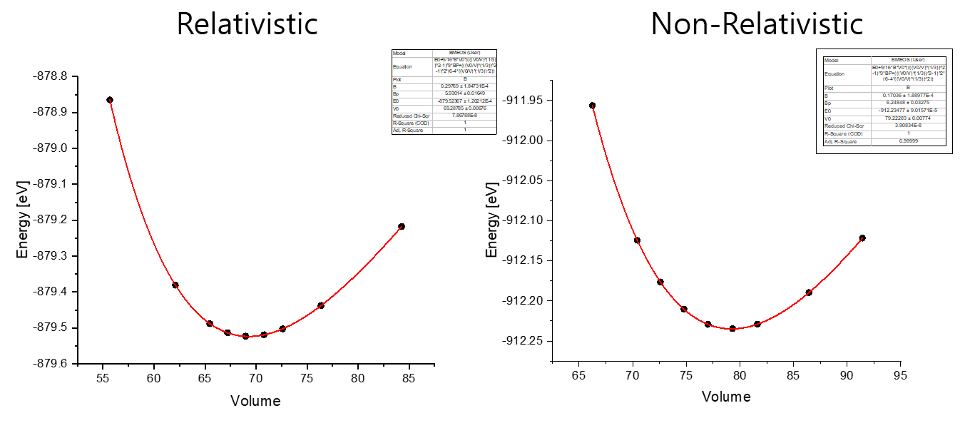 relativistic 효과를 킨 경우 최적화된 volume은 69.28785 Å 이고, relativistic 효과를 끈 경우 최적화된 volume은 79.22283 Å이다. 이를 통해 lattice constant를 구하려면 부피의 세제곱근을 하면 된다. relativistic 효과를 킨 경우 lattice constant는 4.107 Å이고, relativistic 효과를 끈 경우 lattice constant는 4.295 Å이다. reference에서 구한 실험의 lattice constant는 4.080 Å이므로 relativistic 효과를 킨 경우가 더 정확함을 알 수 있다.