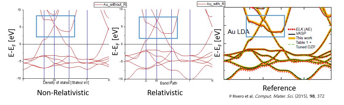 페르미 에너지 위 5eV부분을 보면 relativistic의 band structure은 reference와 비슷하지만, non-relativistic의 band structure은 reference와 상이함을 알 수 있다. 따라서 Au pseudopotential은 relativistic 옵션을 켜야하고, 이를 키지 않을시 문제가 생길 수 있다는 것을 확인할 수 있다.