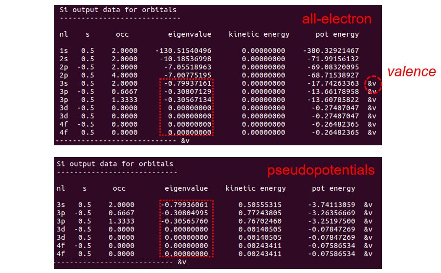 출력 결과에는 all-electron 영역과 pseudopotential 영역의 valence 오비탈 정보가 나타나며,