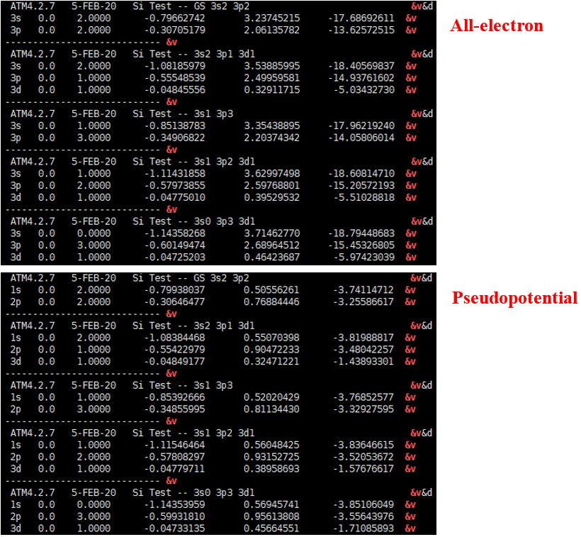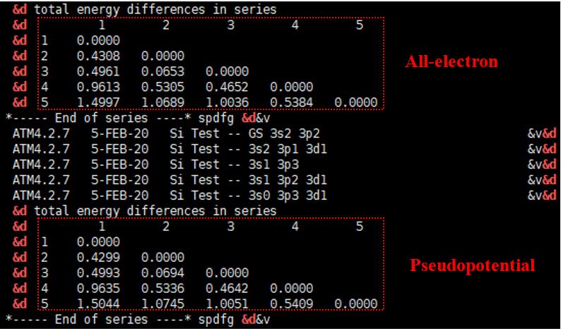 위 과정을 통해 Si 원자의 all-electron과 pseudopotential에 대한 여러 전자배치의 total energy와 eigenvalue를 비교하여, transferability를 시험할 수 있다.