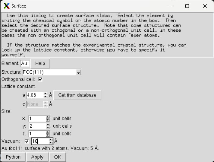 원하는 Element, Lattice Structure and Constant, Vacuum length를 입력한 뒤 Apply