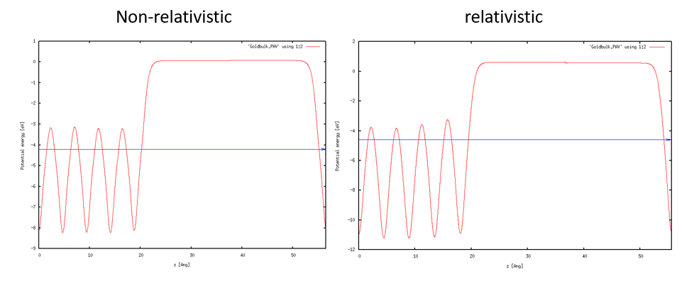 위에서 언급했듯이 원자번호가 큰 원자는 상대론적 효과가 나타난다. 원자의 무게가 크면 클수록 상대론적 효과는 더 크게 나타나고, 상대론적 효과가 커질수록 상대론적 효과를 고려한 pseudopotential과 고려하지 않은 pseudopotential의 결과의 차이가 커진다. 이번에는 79번 Au 원소를 사용해 상대론적 효과를 고려한 pseudopotential과 고려하지 않은 pseudopotential을 만들고 계산을 수행한 후 그 결과를 비교해보겠다.