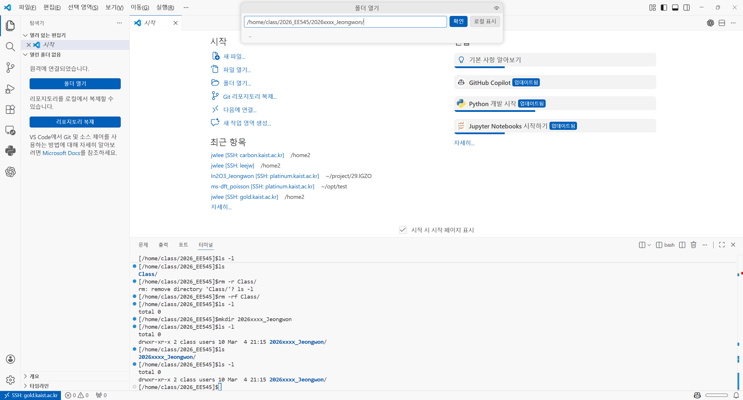 /home/class/...,/home2/class/...,/home/class/2026_EE545/2026xxxx_jeongwon/같은 경로를 입력한 뒤확인을 누른다. - Explorer가 해당 폴더 기준으로 다시 열리면, 그 안에서 파일을 만들고 편집하고 실행한다.
