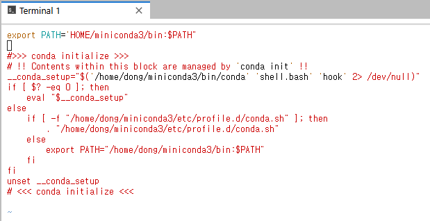 which conda 를 입력하면 miniconda가 경로로 잡히는 것을 볼 수 있다. 이렇게 해당 환경에서의 conda 및 파이썬 설치가 완료된다.