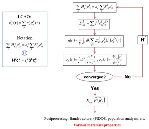 DFT 계산에서 사용되는 알고리즘은 SCF(self-consistent-field) 계산이다. 그림과 같은 SCF loop의 iteration method을 통해 변분법에 따른 안정된 에너지를 가지는 역학적에너지와 포텐셜 에너지의 합을 뜻하는 연산자 Hamiltonian을 구할 수 있다. 이를 통해 band structure, DOS(Density Of States), PDOS(Projected Density Of States) 등 다양한 물질특성을 분석할 수 있다.