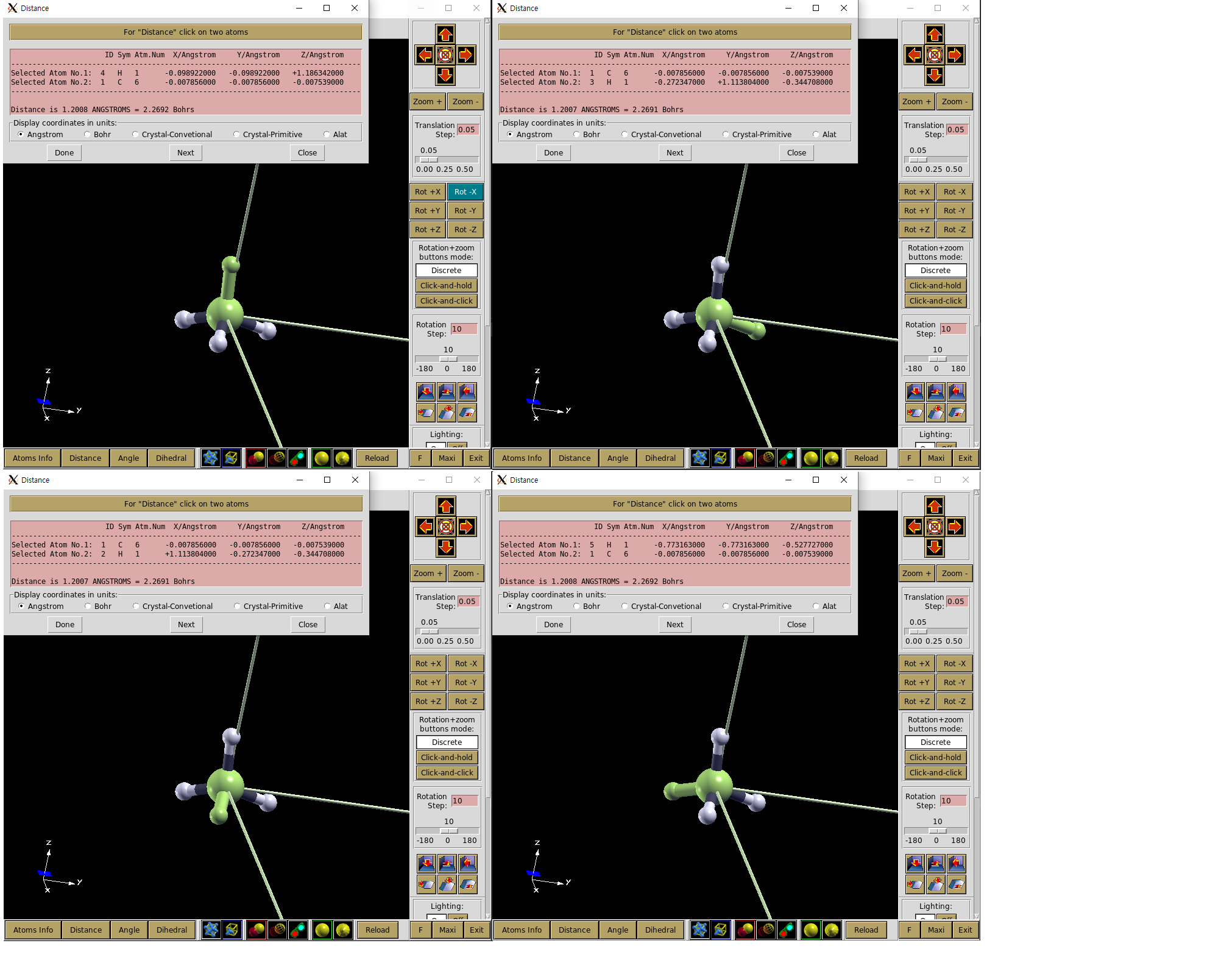 Distance도구를 선택한 뒤 두 원자를 클릭하고Done - 결합 각도 확인: