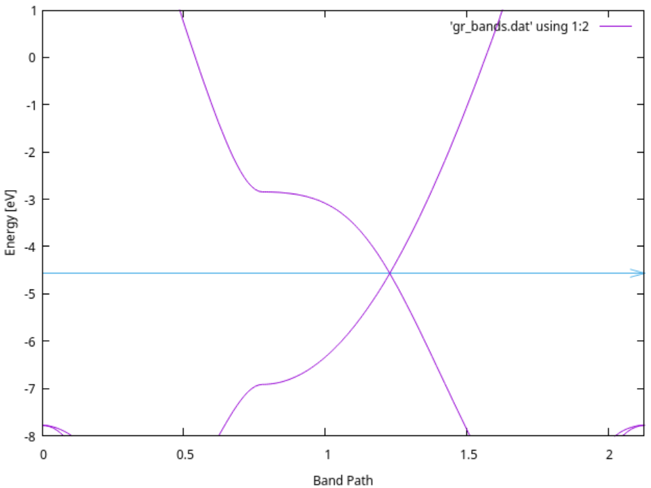 gnuplot> set arrow from 0, -4.5682, graph 1 to 2.1270, -4.5682 ls 3 # Fermi level plot