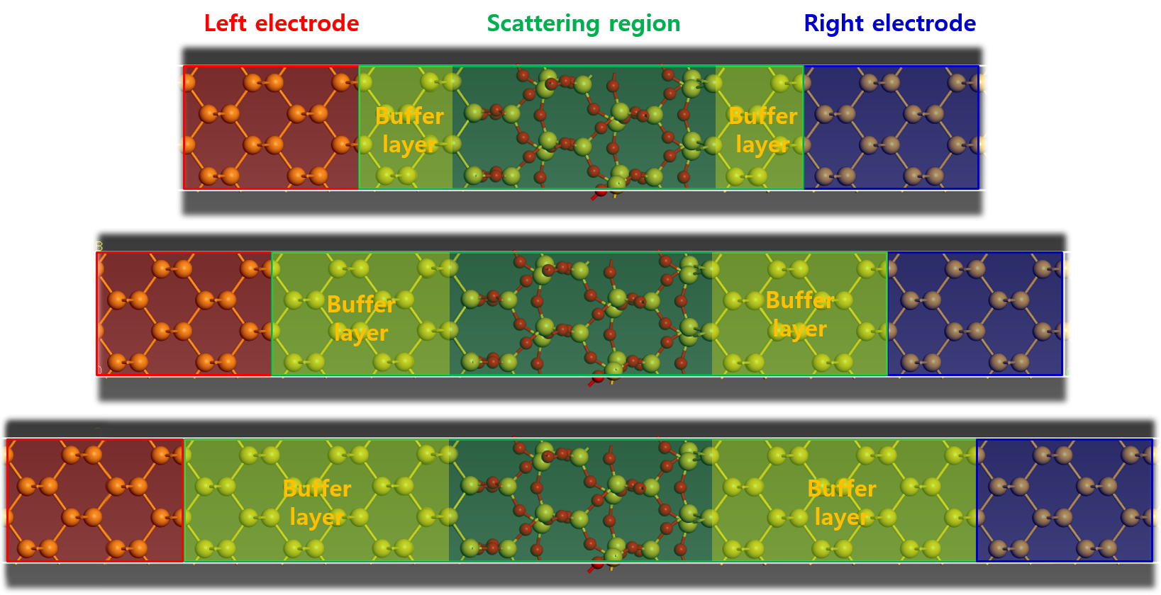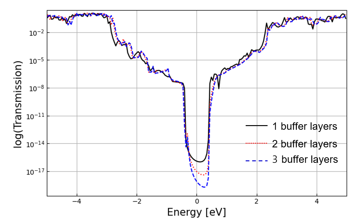 electrode의 unit cell 크기는 유지한 채로 buffer layer만을 조절하여, transmission을 확인한다. 이때, electrode의 unitcell은 principal cell이 되도록 크기를 설정하였다.