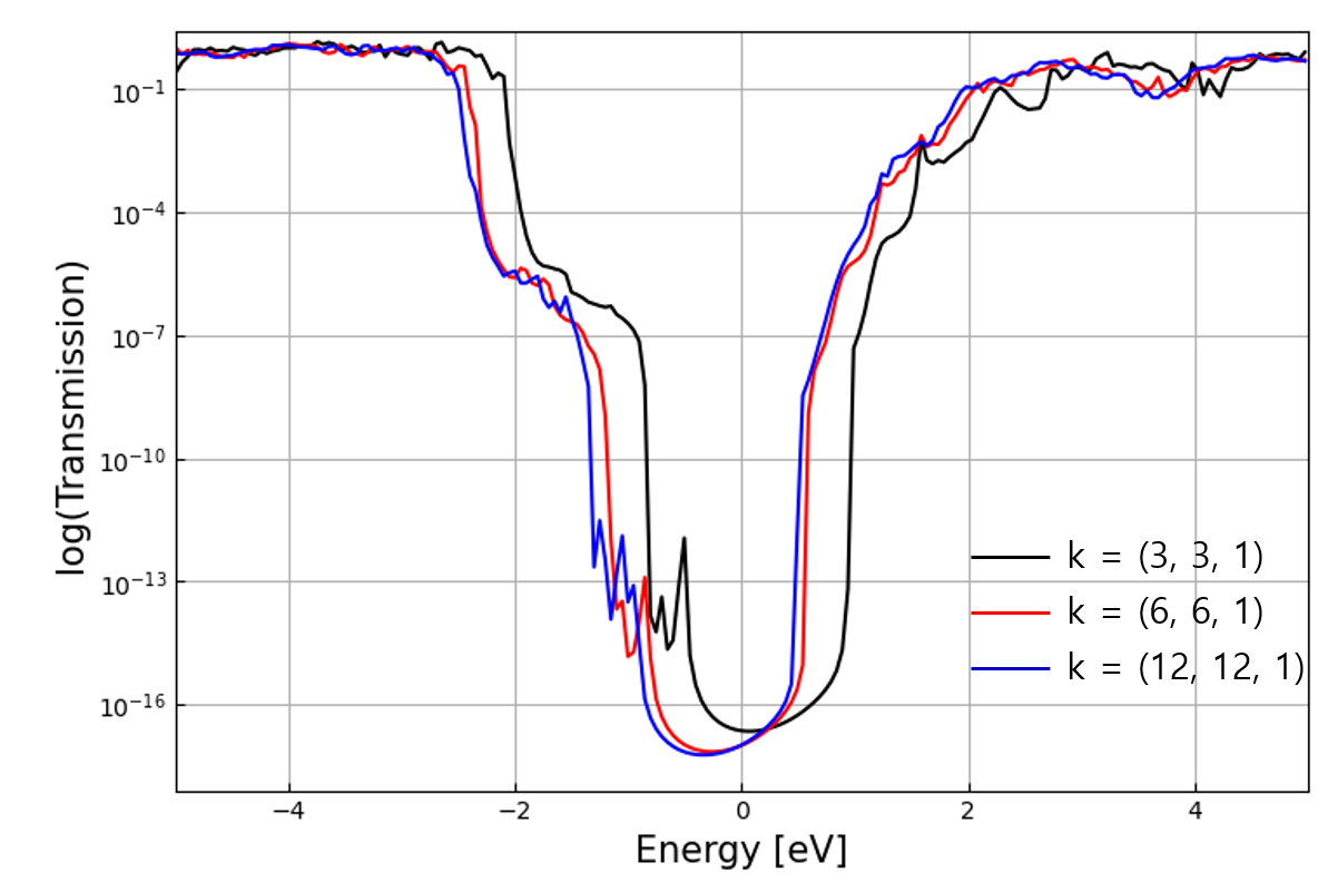 Si-SiO2-Si junction 모델은 3차원이므로 electrode 계산과 scattering 계산에서 kx, ky, kz k-points 증가시키며 transmission이 수렴되는 것을 확인한다.