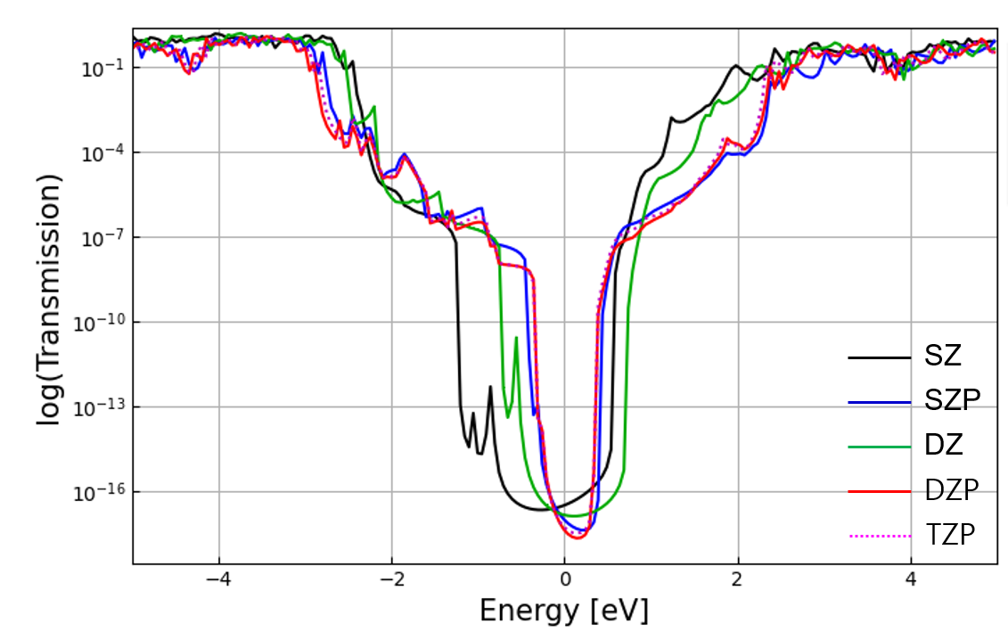 위에서 구한 수렴된 k-points (6 x 6 x 6, 6 x 6 x 1)를 이용하여 Basis size에 따라 transmission 그래프를 확인하여 적절한 basis를 찾는다. 계산시 electrode, Transiesta, TBtrans 계산 모두 동일한 basis size로 해야한다. input 폴더안의 BASIS.fdf 파일에서 옵션을 바꿔가며 baiss test를 진행한다.