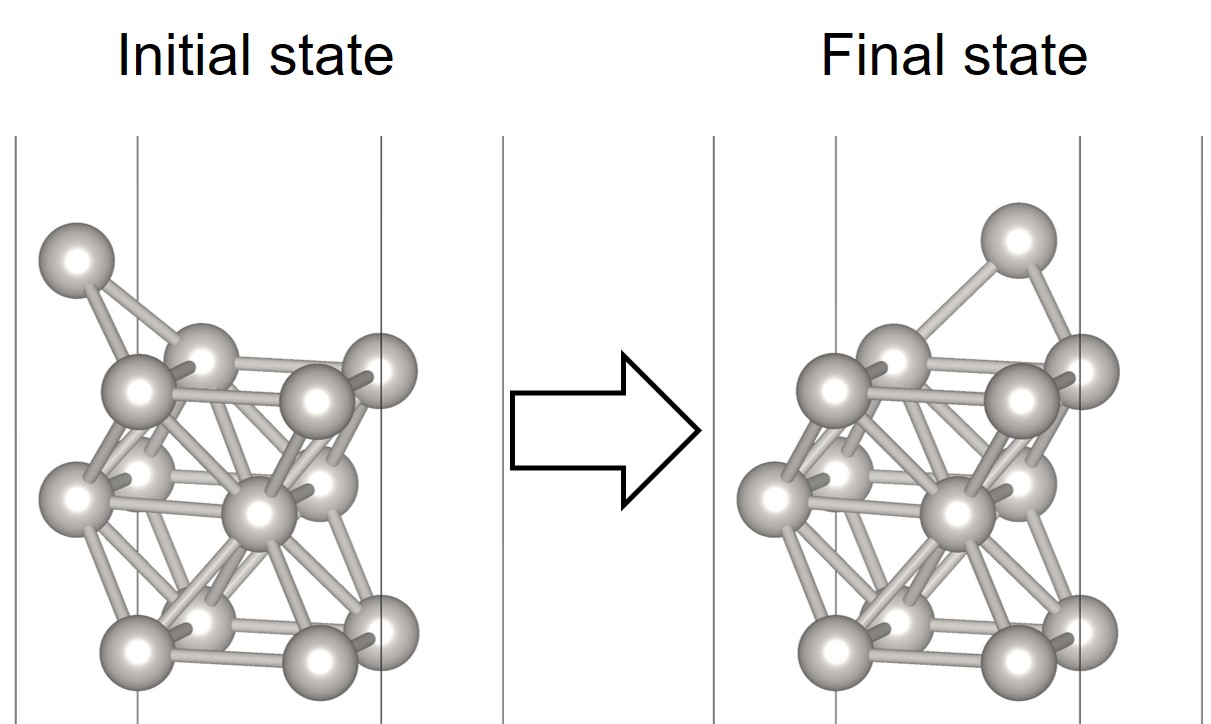 The following NEB example [1] is about calculation of the energy barrier for the self-diffusion of a Pt-adatom on Pt(001). The most stable adsorption site of the adatom Pt@Pt(001) is the hollow(h) position.